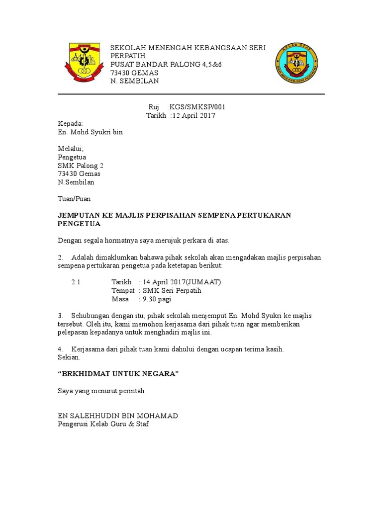 Contoh Surat Jemputan Ke Majlis Perpisahan Guru