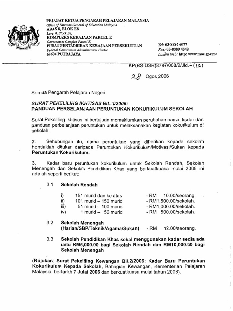 Surat Pekeliling Ikhtisas Bil 7 2006 Panduan Perbelanjaan Peruntukan Kokurikulum Sekolah