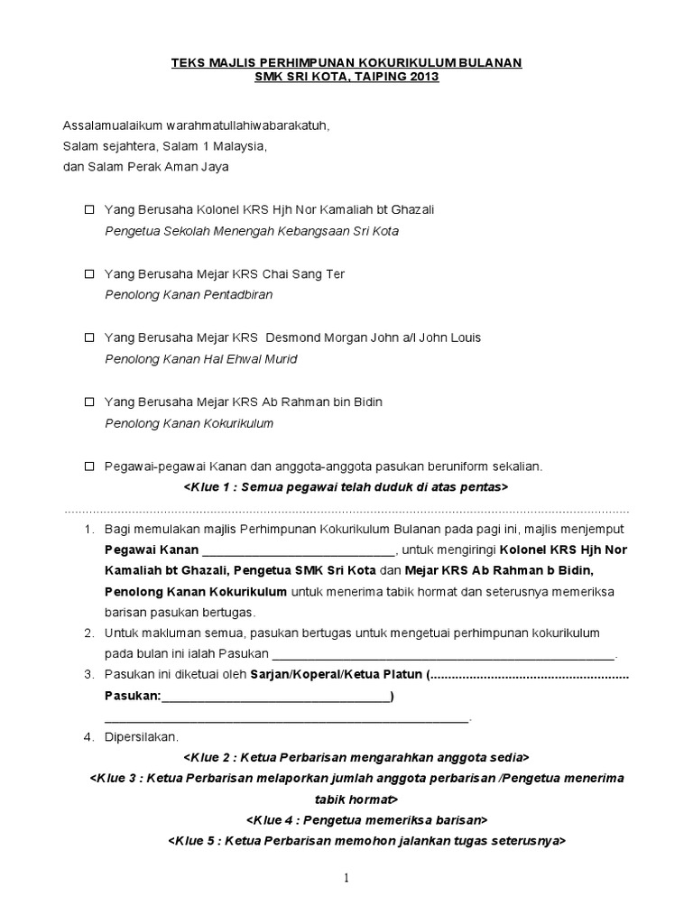 Teks Majlis Perhimpunan Kokurikulum Bulanan
