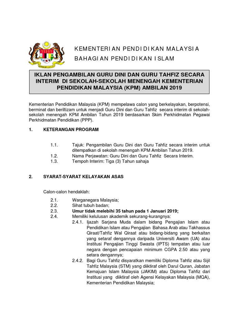 Permohonan Jawatan Kosong Guru Interim Dini Tahfiz Smk 2019