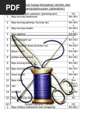 Senarai Harga Tempahan Jahitan Dan Pengubahsuaian