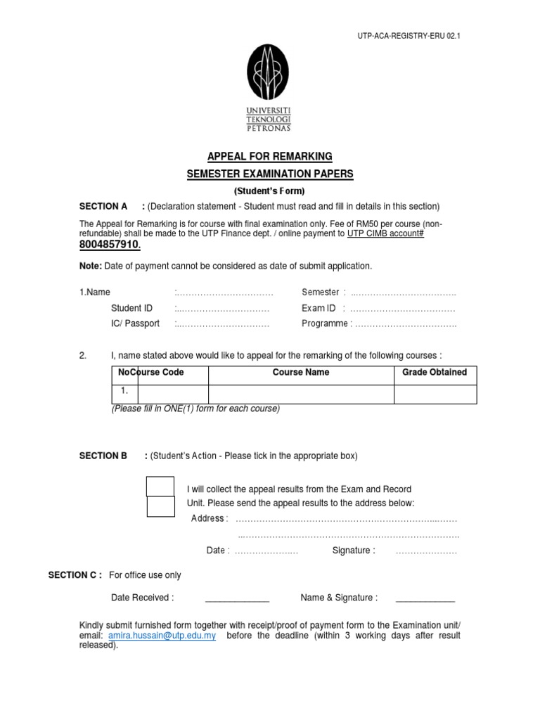 Appeal For Remarking Student Form 9 Utp